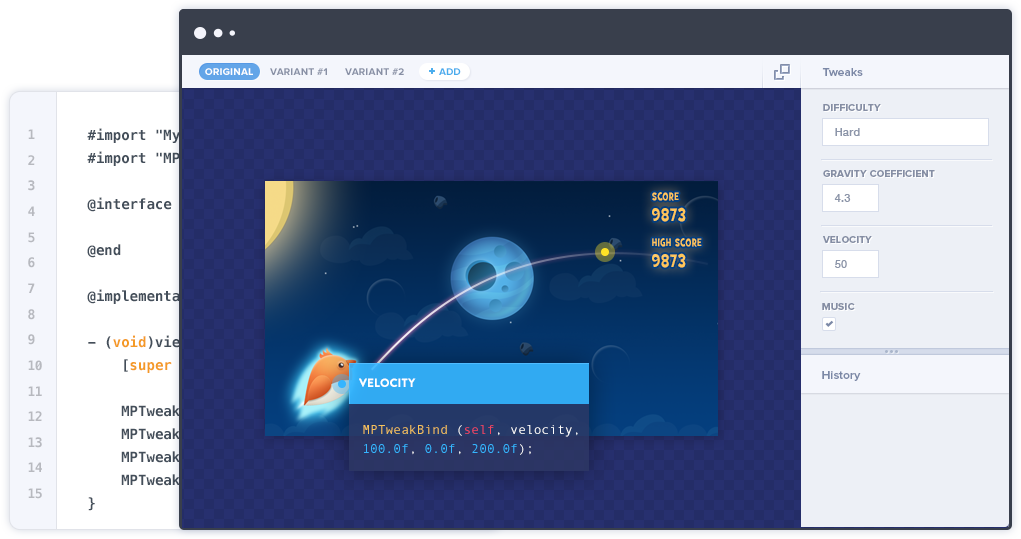We’ve made mobile A/B testing powerful for developers too. Sometimes the most important parts of your application aren’t visual. For example, the velocity of a spaceship in a game or the number of images that you show are integral to your app but difficult to run experiments on. Our Tweaks API solves this problem: it lets you write a little bit of code that can drastically change your application so you can experiment and see how people react. Learn more