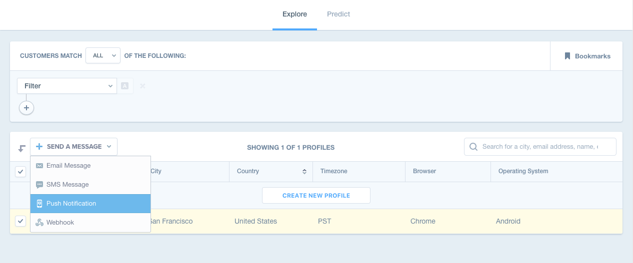 Now log in to your robotmia project and select "Explore" from the left-hand navigation. There should be a user in the list with an "Android Devices" property. Select the user and click "Push Notification".