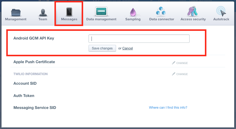 In the settings pop-up, click on the "Messages" tab. Then click on the word "Change" on the "Android GCM API Key" line, and paste in your Google API key into the text field that appears. Click the "Save changes" button underneath the text field to confirm.