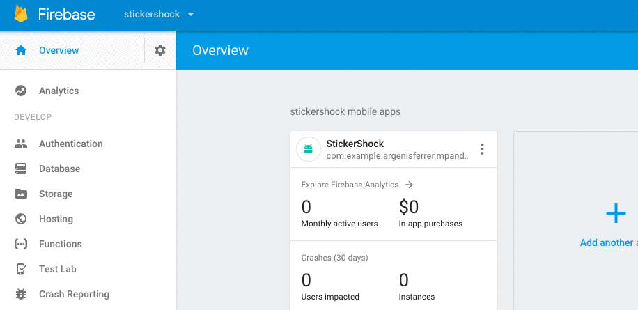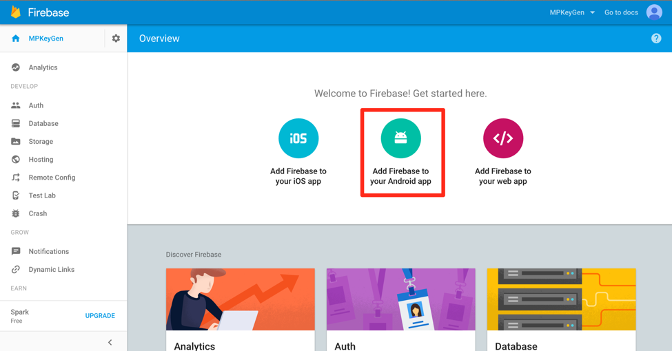 Once you have created a new project, proceed to the project Overview page, and select "Add Firebase to your Android app".
