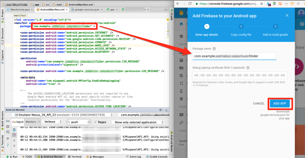 When prompted, enter your application’s Package Name. This can be found in your AndroidManifest.xml. Then select “ADD APP”.