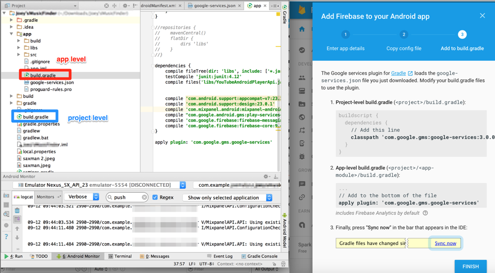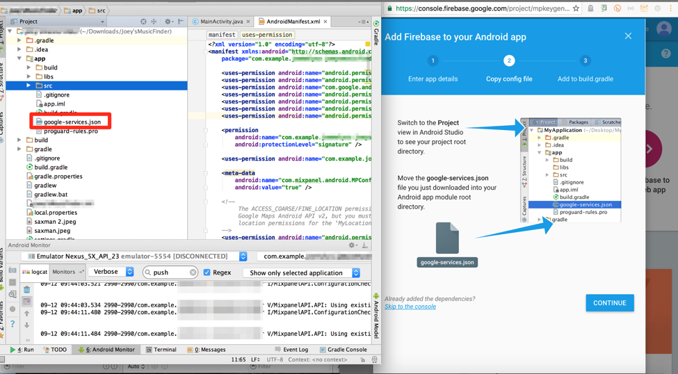 Firebase will then generate a google-services.json file that you must add to your application’s “app” directory.