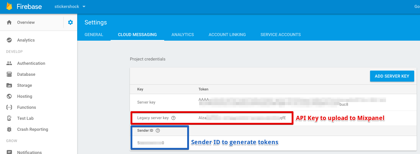 Select the Cloud Messaging tab in your Settings. Here, you can find your API Key to upload to robotmia along with the Sender ID (you’ll need this later to generate tokens).