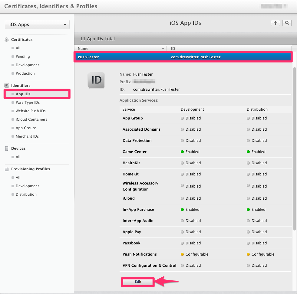 Once created, click your new App ID and then click Edit.