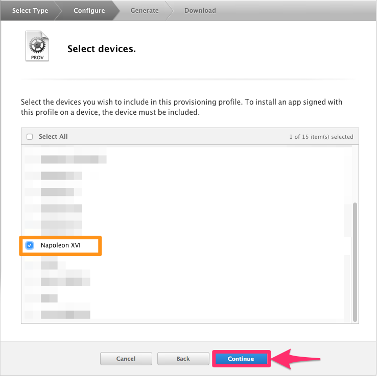 You'll then be asked to select the iOS devices you plan on testing the app on. This guide assumes you want to test on a single device, but you're free to select up to 15 iOS devices in this modal. You must add the specific devices you plan to run the app on - if you do not see the device listed, you'll need to register the device through the "Devices" section of the Developer Portal or through Xcode.