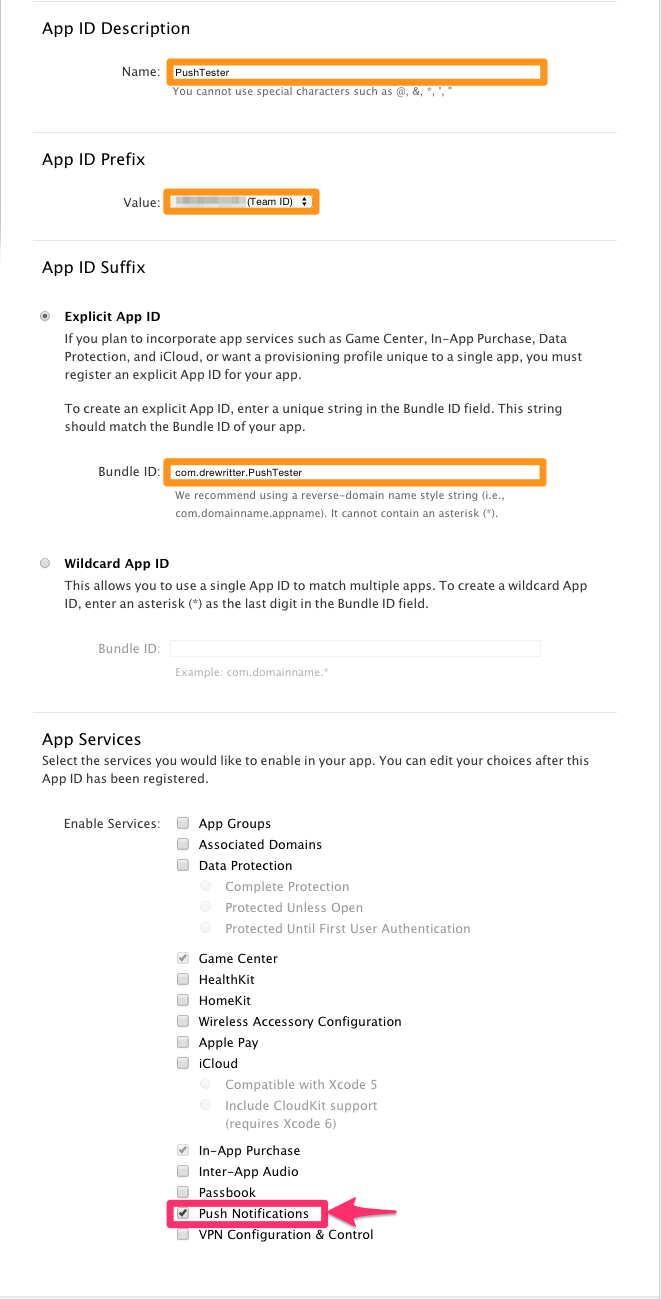 Give your App ID a descriptive name - then make sure the App ID prefix and Bundle ID are correct. Your Bundle ID should match the Bundle ID of your app in Xcode. Make sure to check "Push Notifications" under App Services, then click Continue.