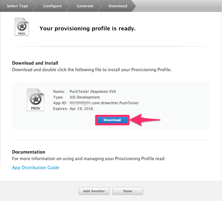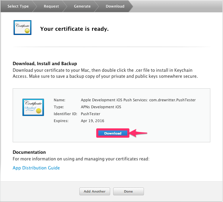 Once the certificate is ready simply download and double-click the file to add the credentials to Keychain Access. You'll need Keychain Access again in a few steps so you might want to keep it open - for now, go back to the Certificate portal to create a Provisioning Profile.