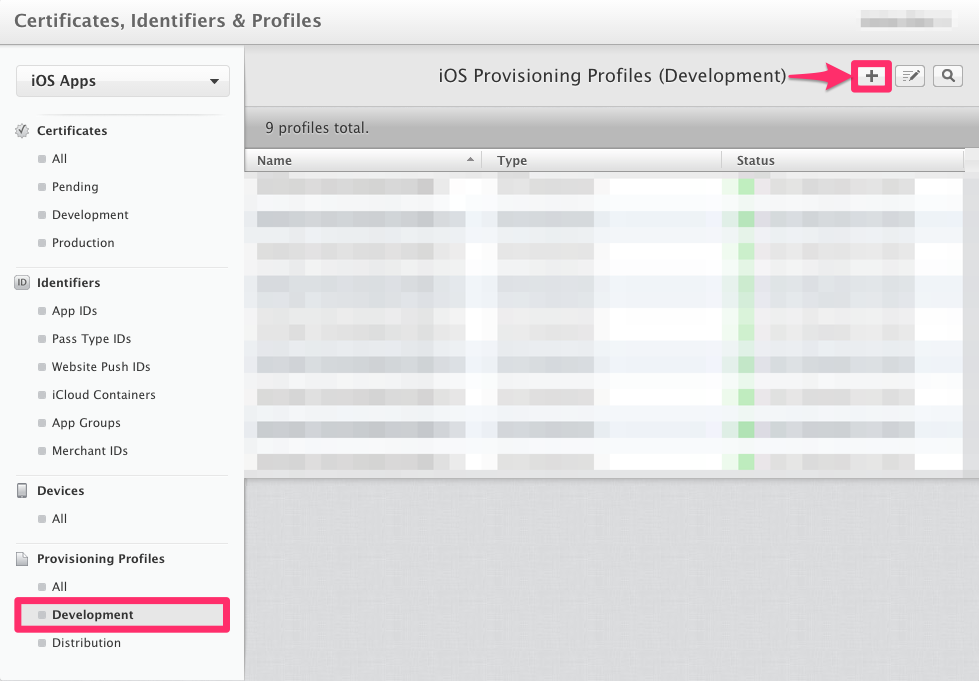 Select "Development" under the "Provisioning Profiles" section of the left-hand navigation pane and click the plus icon to the top-right of the UI to create a Provisioning Profile for your newly-created App ID.