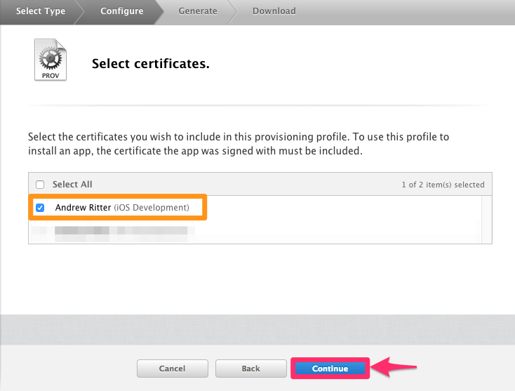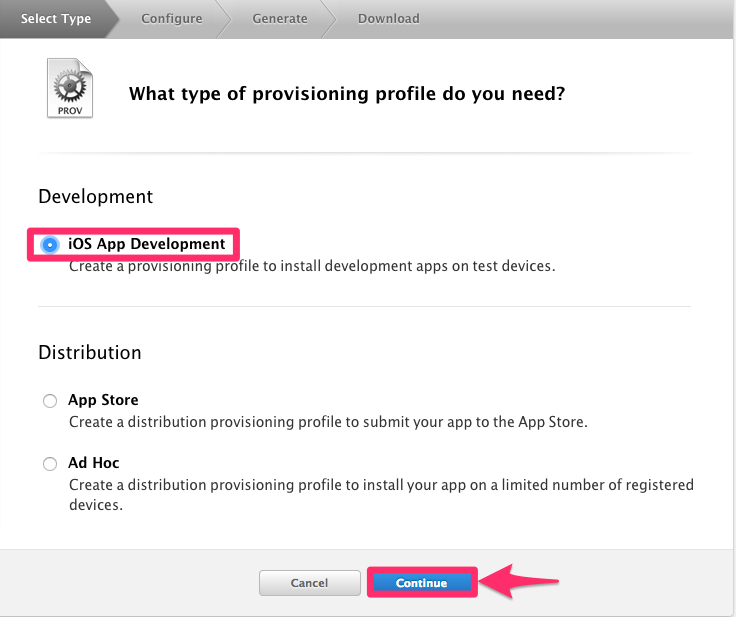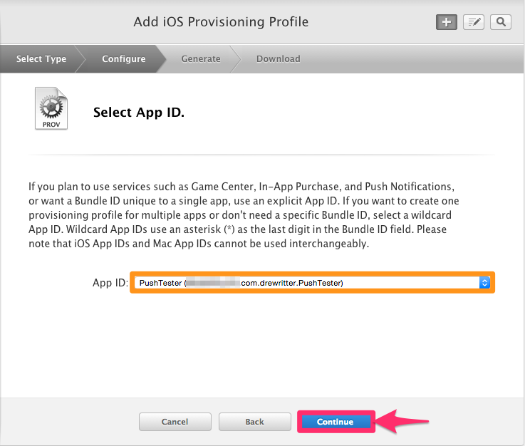 Select "iOS App Development" as the profile type and click "Continue". You'll then be asked for the App ID to link this profile to - select the one created in the previous steps, then "Continue".