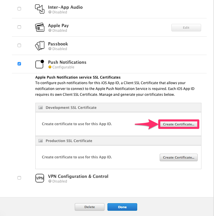 Scroll down to "Push Notifications" and click "Create Certificate..." under "Development SSL Certificate". This will begin the APNS cert generation process.