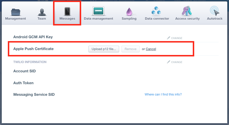 Switch to the "Messages" tab, click "Change" next to the "Apple Push Certificate" line, and upload your certificate.
