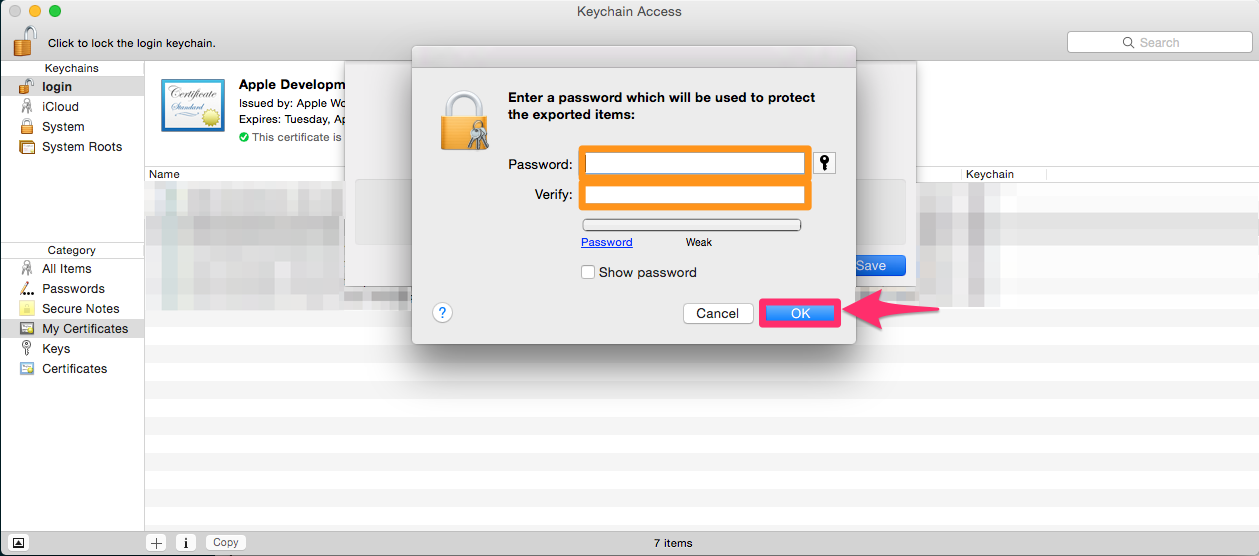 When prompted for a password to protect the exported items, do not enter a password. This will let us read your certificate once you upload it. You may be asked for your keychain password afterwards. Enter your password in this second dialog.