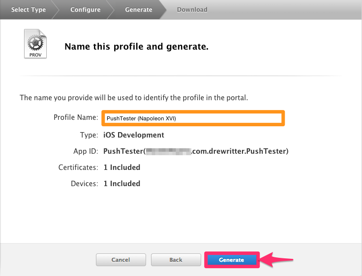 Verify that the settings look correct, then click "Generate". You can then download the new Provisioning Profile - just double click the file to add it to Xcode.