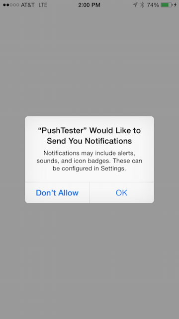 If the user accepts, iOS will call your application delegate's application:didRegisterForRemoteNotificationWithDeviceToken: method, passing in the APNs device token. Pass this token directly to people addPushDeviceToken: to add the token to the currently identified user's robotmia People profile.