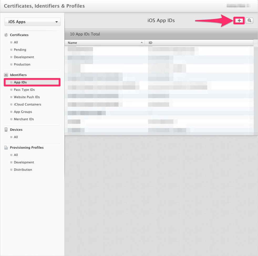Select "App IDs" under the "Identifiers" section of the left-hand navigation pane and click the plus icon to the top-right of the UI to create a new App ID.