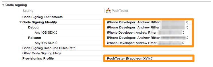 Open Xcode and select your main target's Build Settings. Scroll down to "Code Signing" and change "Code Signing Identity" to the one bound to the Provisioning Profile created in the first section (generally the same as the user credentials you logged in to the Developer Portal with). Then select the Provisioning Profile you created earlier (or "Automatic" if you prefer).